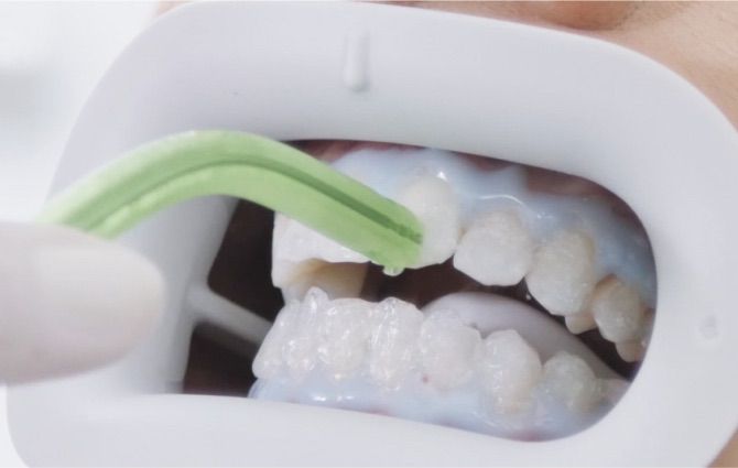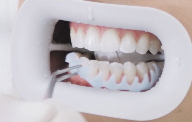 Wenn das Bleichen der Zähne zuhause geschieht (Home-Bleaching), lässt der Zahnarzt eine spezielle Schiene anfertigen. Der Patient füllt sie mit einem Bleichmittel (in Form eines Gels) und trägt die Schiene täglich während ein bis zwei Stunden. Die Dauer und Häufigkeit des Bleichens richtet sich nach dem ge- wünschten Grad der Aufhellung. Die Schiene kann mehrmals gebraucht werden.