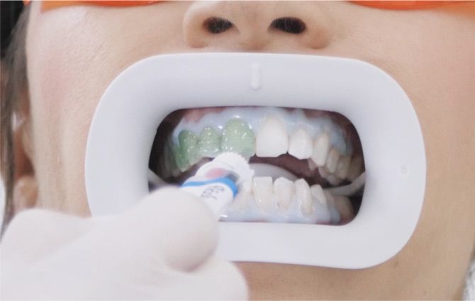 Für die anschließende Zahnaufhellung wird das Zahnfleisch abgedeckt und das Aufhellungsgel mehrmals auf die Zähne aufgetragen. Die fläsh-Zahnaufhellung erfolgt schmelzschonend mittels Lichtaktivierung. In nur einer Stunde haben Sie Ihr strahlendes, jugendliches Lächeln zurück.