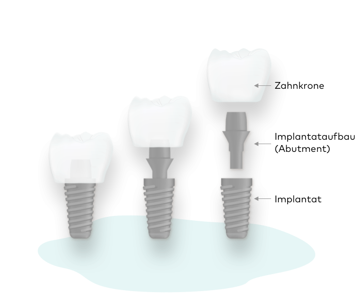 Implantate bestehen aus dem Implantat, das in den Knochen eingebracht wird und dem Implantataufbau, der in das Implantat eingeschraubt wird und die Zahnkrone trägt.
