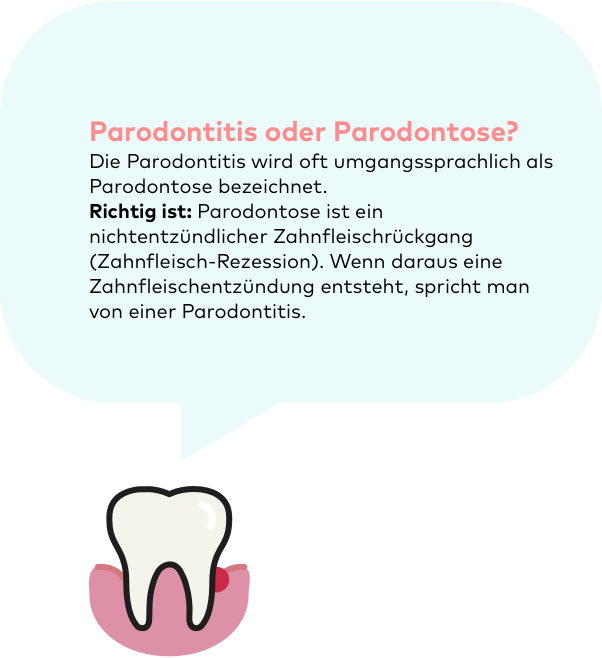 Eine Zahnfleischentzündung (Gingivitis) kann sich zu einer chronischen Erkrankung des Zahnhalteappartes entwickeln (Parodontitis). Sie betrifft dann neben dem Zahnfleisch auch Bestandteile des Zahnhalteapparates (Zahnbett oder Parodontium). Eine Parodontitis kann den Kieferknochen so weit schädigen, dass der Halt der Zähne im Knochen nicht mehr gegeben ist oder sich der Nerv des Zahnes entzündet. Sie kann einzelne, nebeneinander liegende oder alle Zähne befallen.