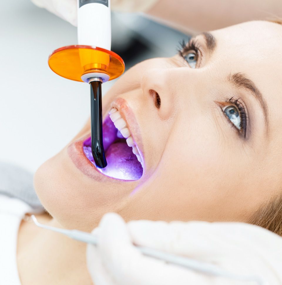 Zum Vorgehen: Im ersten Schritt wird der kariöse Zahnschmelz entfernt und die Kavität aufgeraut. Danach wird weiches Komposit aufgetragen und mit einem UV-Licht ausgehärtet. Durch das Glätten und Polieren am Ende der Behandlung erhält der Zahn eine sehr natürliche Optik.